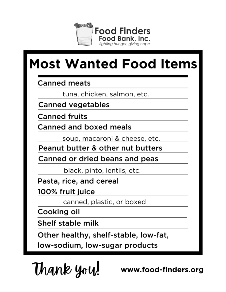 Food Finders Food bank purchases the majority of food in bulk and at reduced, wholesale prices. So, the money you would spend on a turkey might actually be more efficiently used as a donation to Food Finders, since we can buy a lot more food with it than an individual could at a local store.